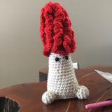 Plush Mushroom Sprite.  These sprites may be weighted to keep it easier to stay upright. Made of acrylic, poly fill and weighted poly beads with safety eyes.  Not intended for kids under 3 due to small parts.