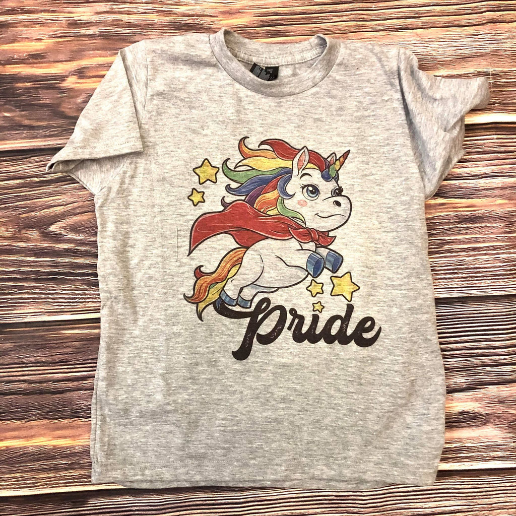 A pride shirt in youth sizes featuring a unicorn with rainbows.
