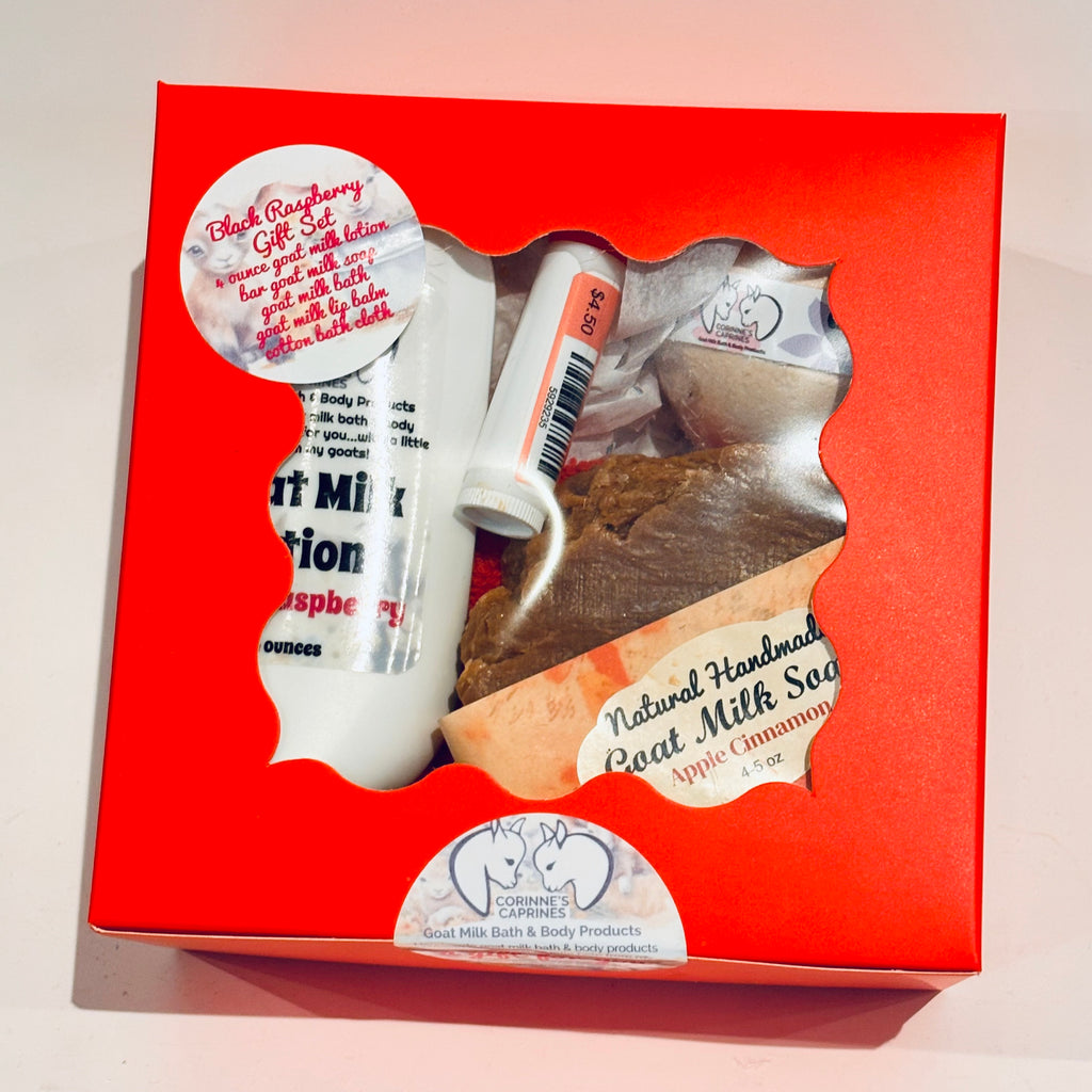 This gift box contains a 4 ounce goat milk lotion, 100 gram goat milk bath, goat milk soap and a hand knit wash cloth.